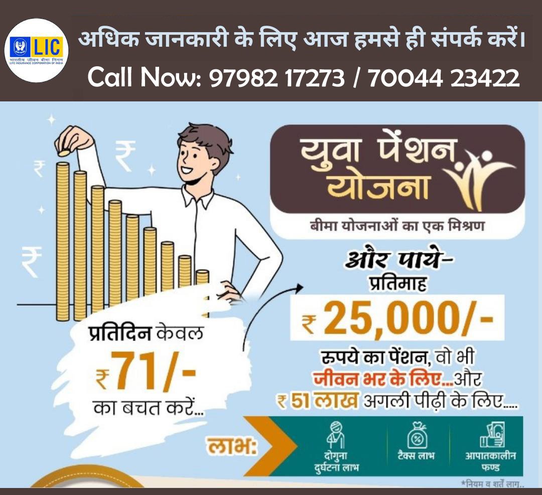युवा पेंशन योजना। बीमा योजनाओं का एक अद्भुत मिश्रण! प्रतिदिन केवल ₹71/- का बचत करें । और पाएं: प्रति माह ₹25,000/- पेंशन, वो भी जीवन भर के लिए और ₹51 लाख अगली पीढ़ी के लिए । लाभ: दोगुना दुर्घटना लाभ, टैक्स लाभ, आपातकालीन फंड । सुरक्षित भविष्य का वादा!