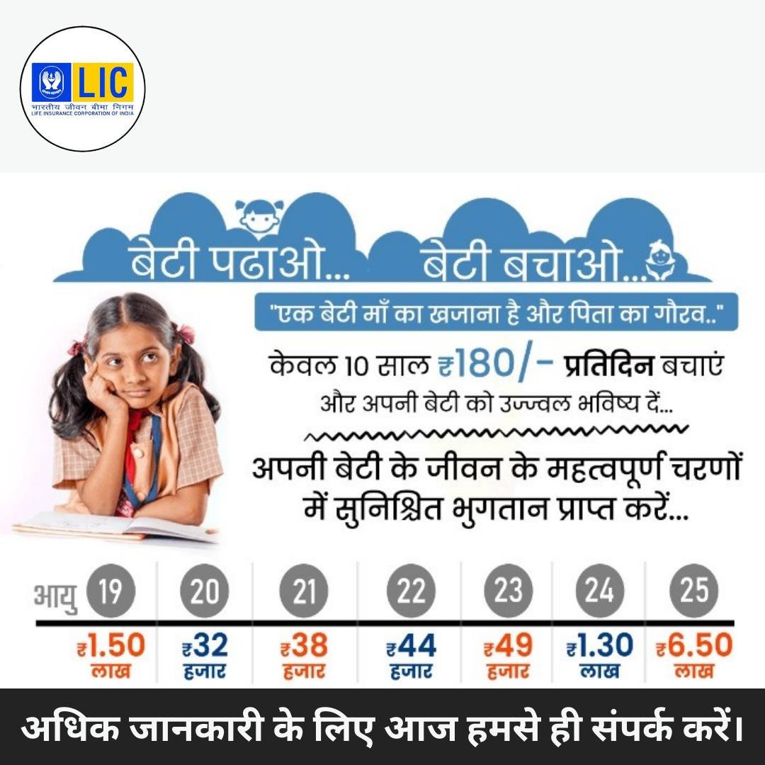 बेटी पढ़ाओ, बेटी बचाओ "एक बेटी माँ का खजाना है और पिता का गौरव केवल ₹180/- प्रतिदिन 10 साल तक बचाएं और अपनी बेटी को उज्ज्वल भविष्य दें।" *महत्वपूर्ण चरणों में सुनिश्चित भुगतान प्राप्त करें: आयु 19: ₹1.50 लाख आयु 20: ₹32 हजार आयु 21: ₹38 हजार आयु 22: ₹44 हजार आयु 23: ₹49 हजार आयु 24: ₹1.30 लाख आयु 25: ₹6.50 लाख *बेटी के हर सपने को साकार करें!